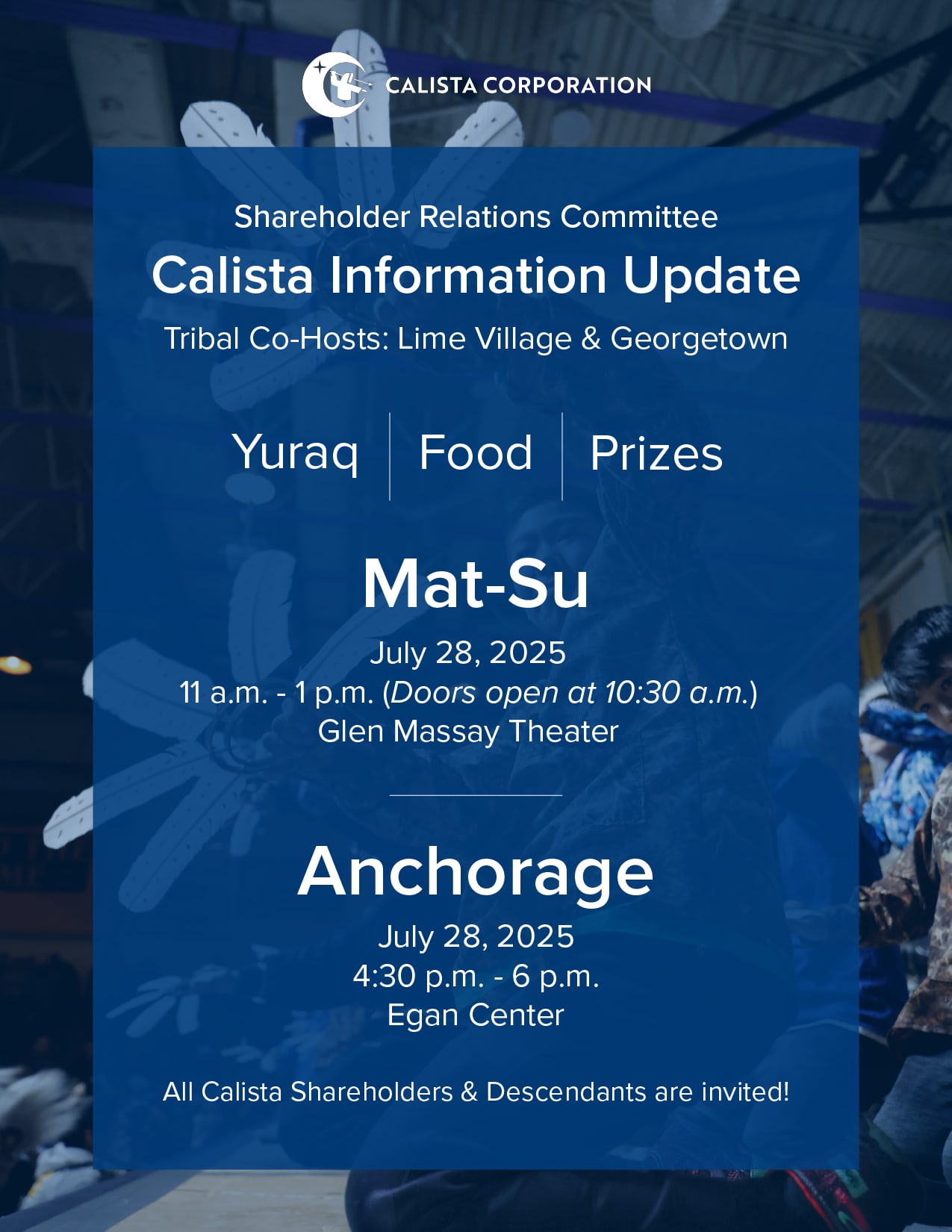 Calista Corporation’s Board of Directors is holding Shareholder Relations Committee (SRC) meetings in the Mat-Su and Anchorage on Monday, July 28. These meetings are open to all Calista Shareholders and Descendants.